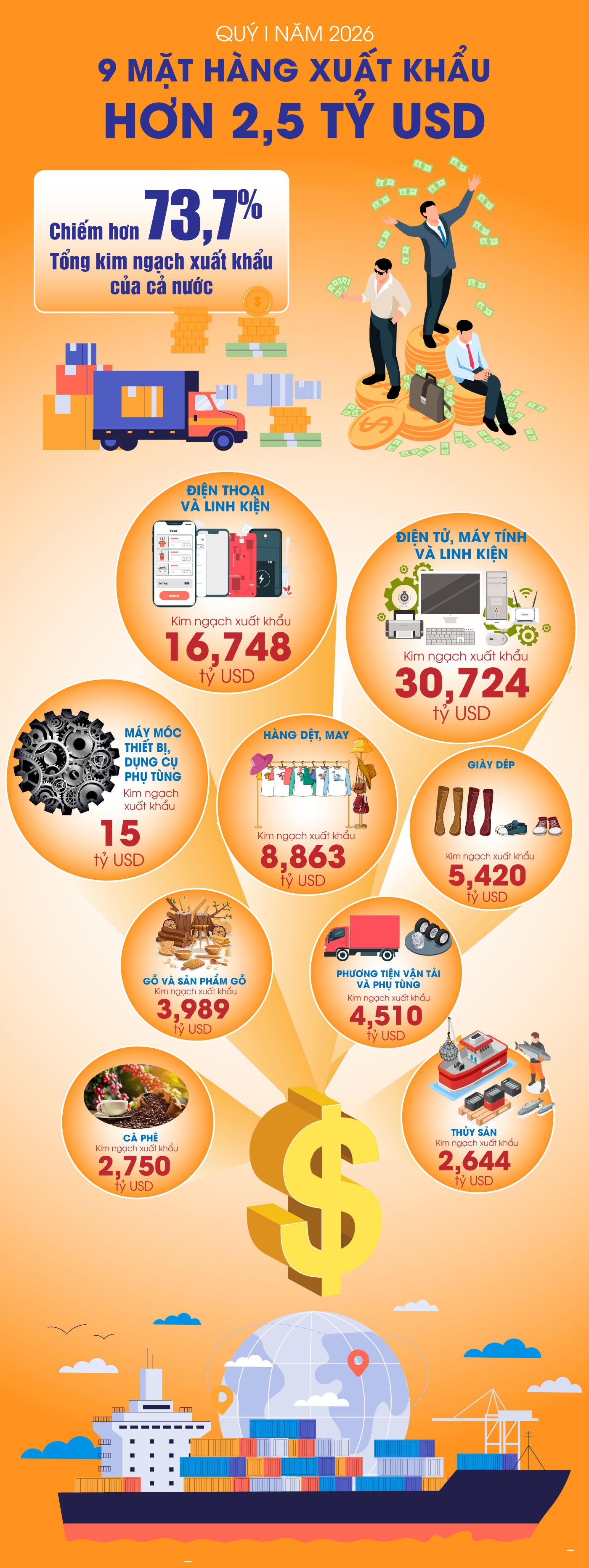 Quý I năm 2026, có 9 mặt hàng đạt kim ngạch xuất khẩu trên 2 tỷ USD, chiếm 73,7% tổng kim ngạch xuất khẩu. Trong đó, mặt hàng điện tử, máy tính và linh kiện đứng đầu với 30,724 tỷ USD.