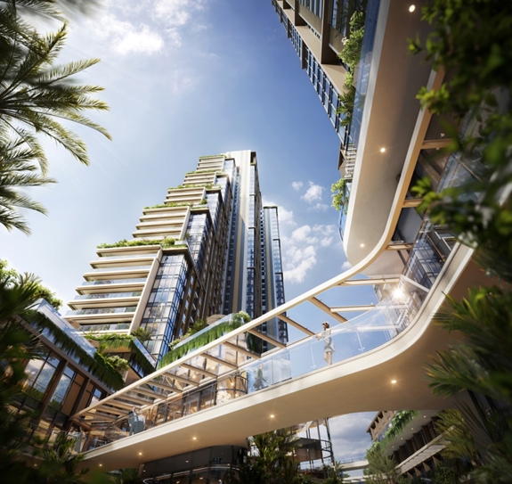 Cầu cảnh quan kết nối hai tòa tháp nằm tại tầng 4, đón trọn những góc nhìn đẹp nhất hướng ra vịnh - hồ - phố, đan xen khéo léo cùng những khoảng sân vườn và tiện ích xanh mát. Ảnh: BIM Land |