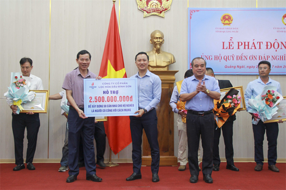 Sáng 26-7, trong chương trình phát động Quỹ “Đền ơn đáp nghĩa năm 2023” do Ủy ban MTTQ Việt Nam tỉnh Quảng Ngãi phối hợp tổ chức, BSR đã đóng góp 2,5 tỷ đồng cho Quỹ đền ơn đáp nghĩa của UBND tỉnh Quảng Ngãi để xây dựng Nhà đại đoàn kết cho hộ nghèo thuộc diện gia đình chính sách, người có công với cách mạng… Số tiền ủng hộ quỹ Đền ơn đáp nghĩa đến từ quỹ an sinh xã hội năm 2023-2024.