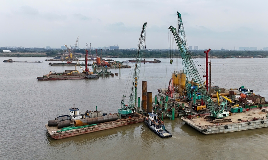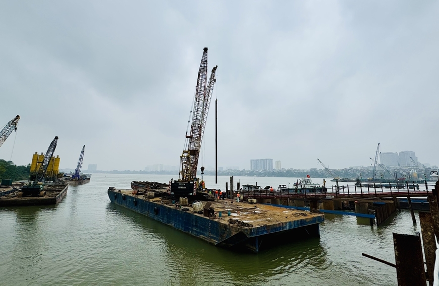 Các nhà thầu cho biết đã bố trí mỗi đơn vị 2 mũi thi công các trụ cầu chính dưới sông Hồng. Hàng trăm kỹ sư, thợ vận hành và cán bộ, công nhân làm việc liên tục xuyên Tết. Cả công trình hiện chỉ còn trụ T1 bên phía quận Hoàn Kiếm (cũ) chưa thi công được do vướng mặt bằng. Các trụ còn lại đều đảm bảo tiến độ.