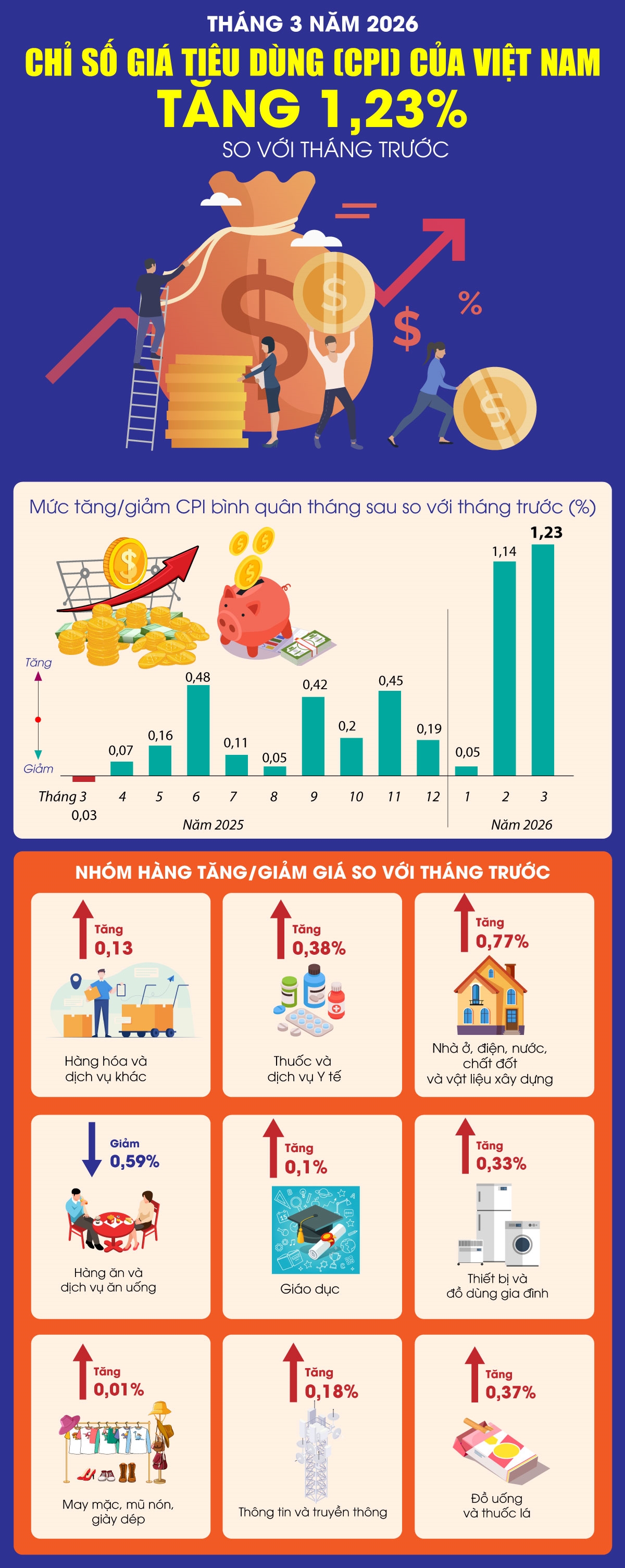 Chỉ số giá tiêu dùng (CPI) của Việt Nam tháng 3-2026 tăng 1,23% so với tháng trước, do giá xăng dầu trong nước tăng cao theo giá nhiên liệu thế giới, cùng giá vật liệu xây dựng tăng do chi phí nguyên liệu đầu vào và vận chuyển gia tăng. Trong mức tăng 1,23% của CPI tháng 3 so với tháng trước, có 9 nhóm hàng hóa và dịch vụ có chỉ số giá tăng, 2 nhóm hàng có chỉ số giá giảm.