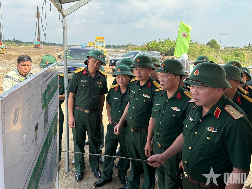 | Thiếu tướng Nguyễn Hữu Ngọc, Tư lệnh Binh đoàn 12 kiểm tra tiến độ thi công các dự án do đơn vị đảm nhận tại Cà Mau. |