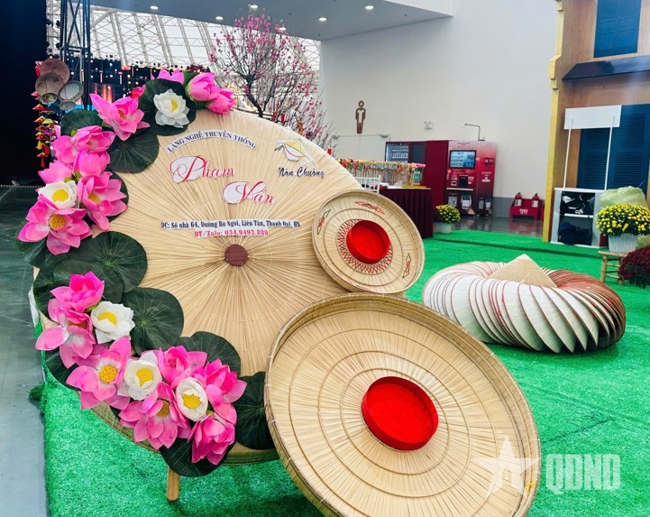 | Gian hàng đẹp mắt của nón làng Chuông (TP Hà Nội) thu hút nhiều du khách. |