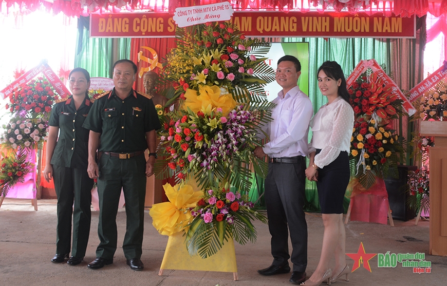 | Đại diện Công ty Trách nhiệm hữu hạn Một thành viên Cà phê 15 (Quân khu 5) tặng hoa chúc mừng Hợp tác xã Tấn Khang. |