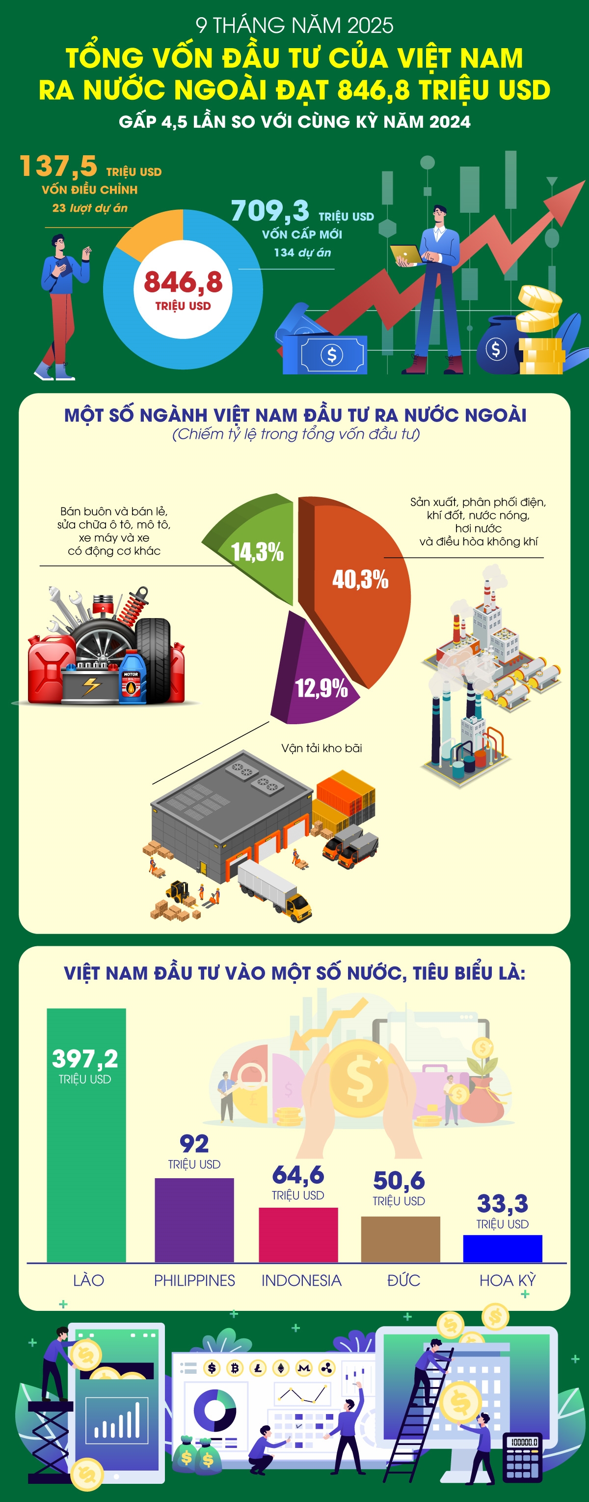 9 tháng năm 2025, tổng vốn đầu tư của Việt Nam ra nước ngoài (vốn cấp mới và điều chỉnh) đạt 846,8 triệu USD, gấp 4,5 lần so với cùng kỳ năm 2024.