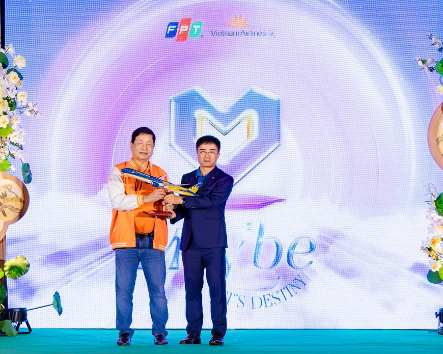 | Lãnh đạo Vietnam Airlines trao kỷ niệm tặng lãnh đạo FPT tại sự kiện. |