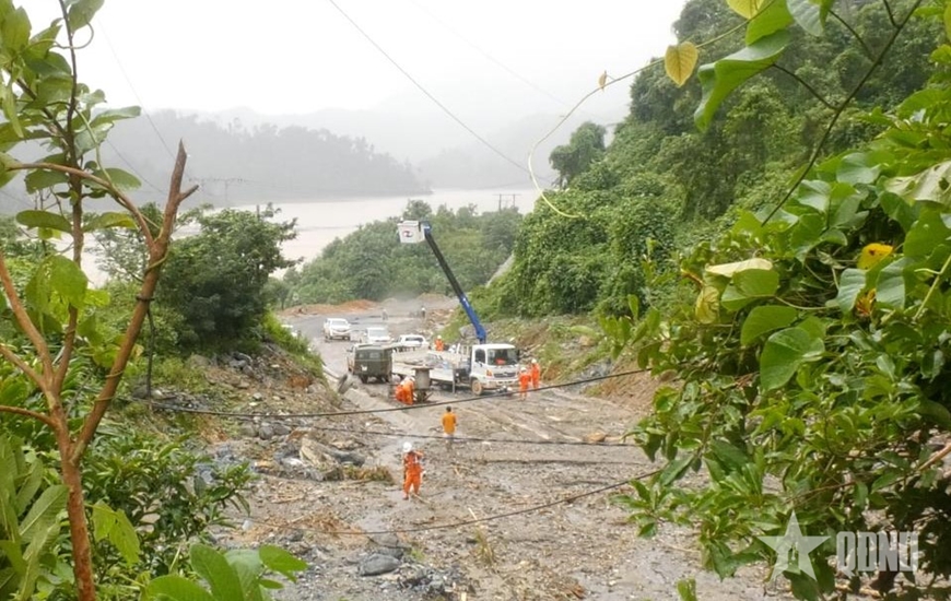 Cán bộ, nhân viên các đơn vị thuộc Tổng công ty Điện lực miền Trung triển khai lực lượng, phương tiện khắc phục các sự cố sau lũ.