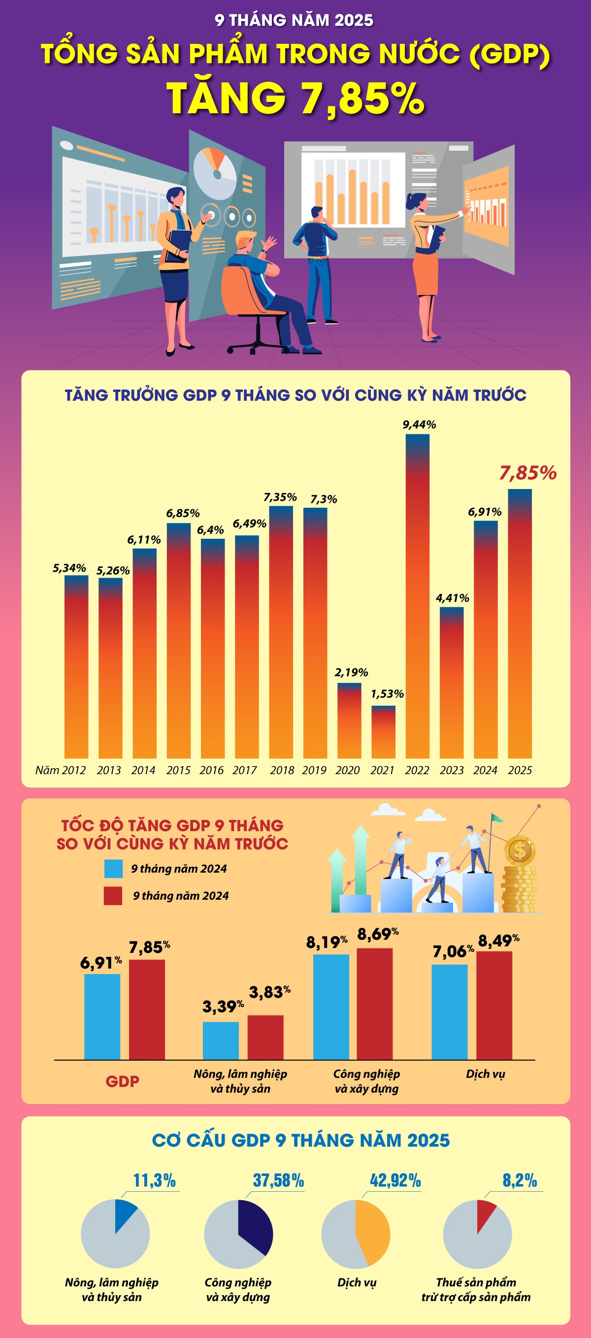 Tổng sản phẩm trong nước (GDP) 9 tháng năm 2025 ước tăng 7,85% so với cùng kỳ năm trước, chỉ thấp hơn tốc độ tăng 9,44% của cùng kỳ năm 2022 trong giai đoạn 2011-2025.