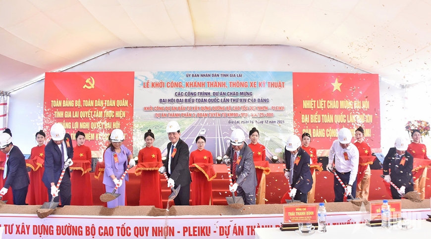 Theo đó, có 8 dự án khởi công gồm: Dự án Đầu tư xây dựng đường bộ cao tốc Quy Nhơn - Pleiku; Dự án Tuyến đường kết nối từ Cao tốc Bắc - Nam về KCN Phù Mỹ; Dự án Tuyến đường nối từ quốc lộ 1 đến đường ven biển (ĐT.639) kết nối với Cảng Đề Gi; Dự án Khu công nghiệp Bình Nghi: Xã Tây Sơn, xã An Nhơn Tây; Dự án Trung tâm nghiên cứu trí tuệ nhân tạo AI: Phường Quy Nhơn Tây và phường Quy Nhơn Bắc; Dự án Đầu tư mở rộng nâng công suất Nhà máy đường An Khê (Giai đoạn 2: Nâng công suất ép lên 25.000 TMN); Dự án xây dựng nhà ở chung cư hỗn hợp: 72B Tây Sơn, phường Quy Nhơn Nam, tỉnh Gia Lai; Dự án Điểm số 2 (2-2), Khu du lịch biển Nhơn Lý - Cát Tiến: Khu kinh tế Nhơn Hội, xã Ngô Mây