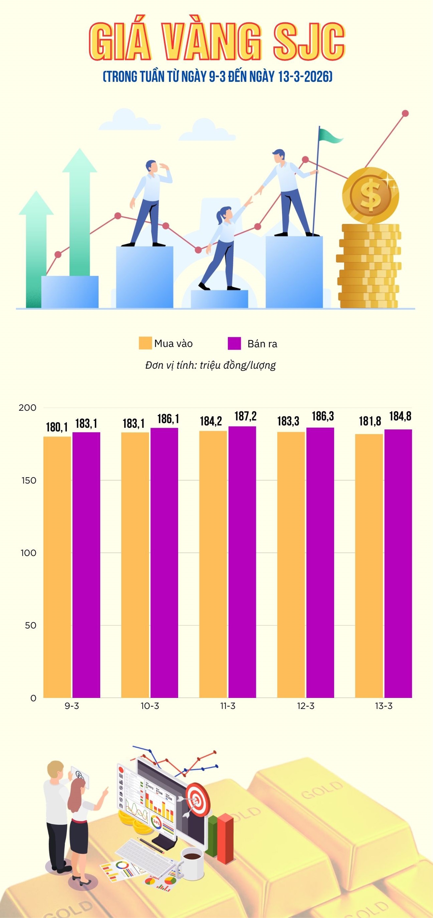 Giá vàng hôm nay (13-3): Giá vàng miếng và vàng nhẫn đảo chiều giảm đến 1 triệu đồng/lượng ở cả hai chiều, bán ra ở mức 186,3 triệu đồng/lượng. Giá vàng thế giới cũng giảm hơn 90 USD/ounce, hiện đang neo ở mức 5.082 USD/ounce.