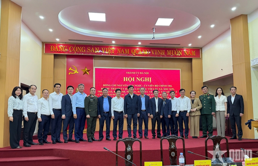 | Đồng chí Nguyễn Duy Ngọc, Bí thư Thành ủy Hà Nội và các đồng chí lãnh đạo thành phố với lãnh đạo 5 xã Sóc Sơn, Nội Bài, Trung Giã, Đa Phúc, Kim Anh tại cuộc làm việc. |
