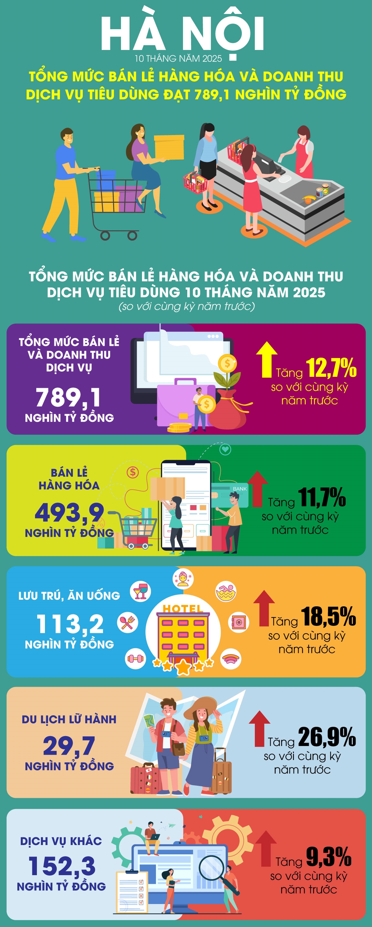 Theo Cục Thống kê TP Hà Nội, trong 10 tháng năm 2025, tổng mức bán lẻ hàng hóa và doanh thu dịch vụ tiêu dùng của thành phố đạt 789,1 nghìn tỷ đồng, tăng 12,7% so với cùng kỳ năm trước, trong đó: Doanh thu bán lẻ hàng hóa đạt 493,9 nghìn tỷ đồng, chiếm 62,6% tổng mức và tăng 11,7% so với cùng kỳ năm trước.