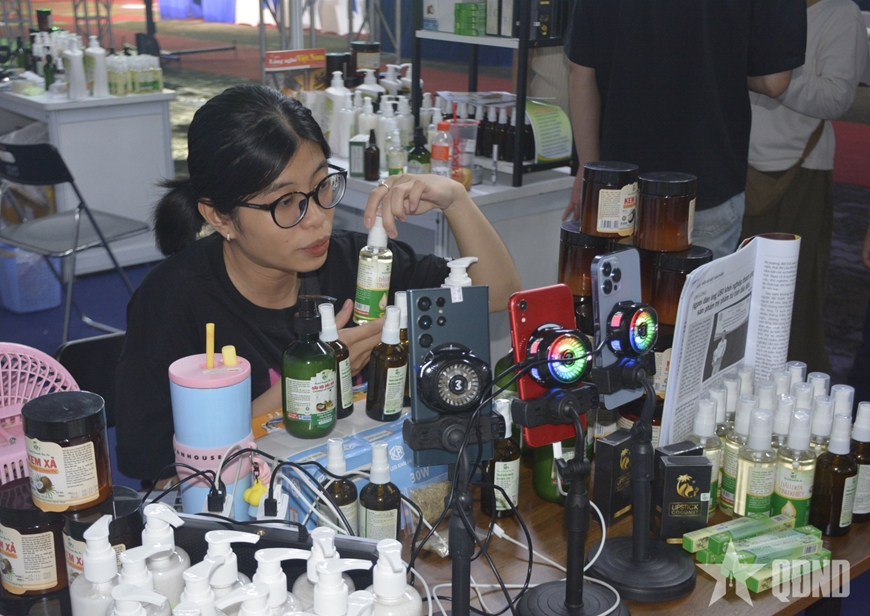 | Một phiên livestream bán hàng của doanh nghiệp tại hội chợ. |