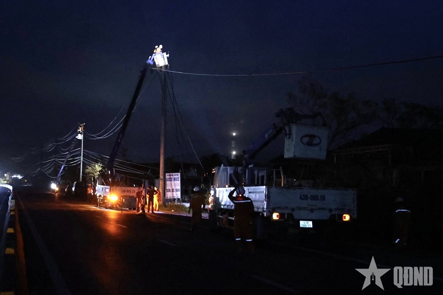Công nhân ngành điện xuyên đêm khôi phục lưới điện. |