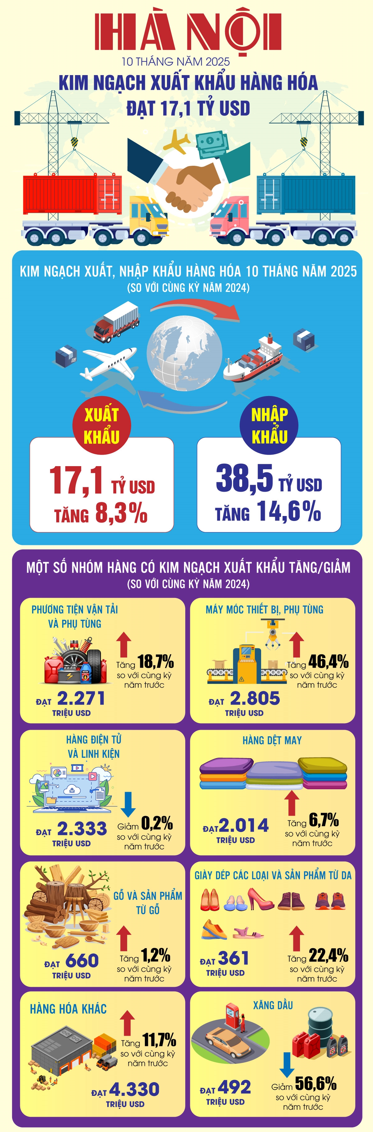 Tính chung 10 tháng năm 2025, kim ngạch xuất khẩu hàng hóa của Hà Nội ước tính đạt 17,1 tỷ USD, tăng 8,3% so với cùng kỳ năm trước...