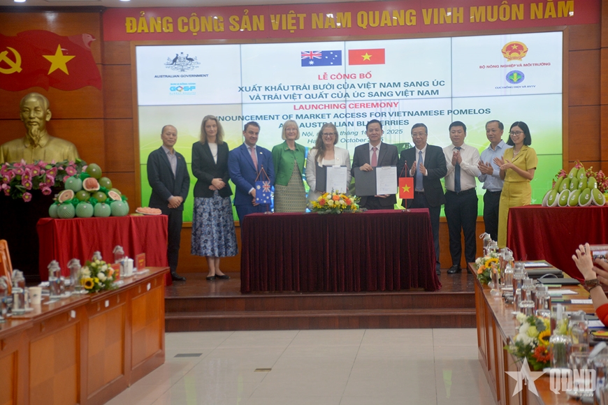 Sáng 9-10, tại Hà Nội, Cục Trồng trọt và Bảo vệ thực vật (Bộ Nông nghiệp và Môi trường) phối hợp với Đại sứ quán Australia tại Việt Nam tổ chức lễ công bố xuất khẩu trái bưởi (Pomelos) của Việt Nam sang Australia và trái việt quất (Bluberries) của Australia sang Việt Nam.