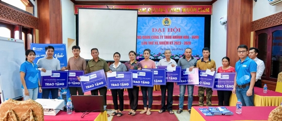 Đại diện Mcredit trao tặng phần quà cho các công nhân có hoàn cảnh khó khăn tại Công ty Than Khánh Hòa (Thái Nguyên). |