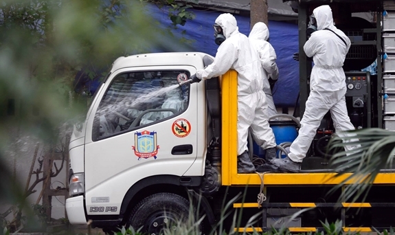 Quân đội tiến hành phun hóa chất, tiêu tẩy, khử khuẩn khu vực các phố Trúc Bạch, Châu Long, Nguyễn Tri Phương (quận Ba Đình, Hà Nội). Ảnh: qdnd.vn.