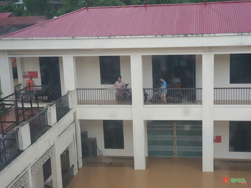 | Huyện Sơn Động, Bắc Giang bị cô lập. Điện lực Sơn Động đã kịp thời sơ tán vật tư, thiết bị lên tầng 2 nhà điều hành. |