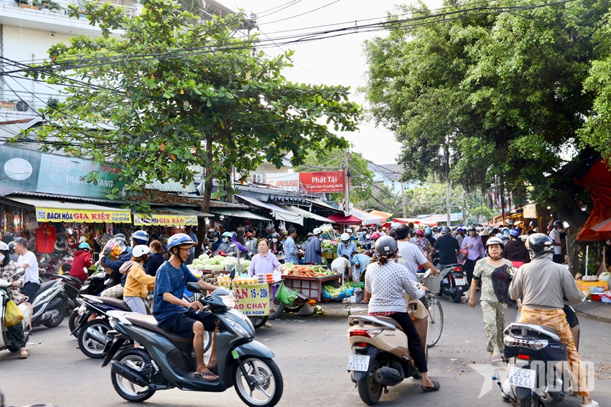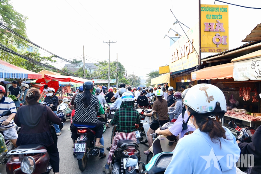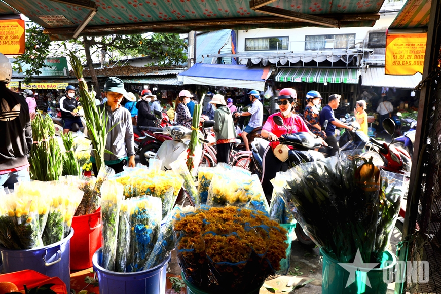Song song với siêu thị hiện đại, các chợ truyền thống vẫn giữ sức hút đặc biệt trong những ngày cận Tết. Từ sáng sớm, nhiều khu chợ đã đông nghịt người qua lại. Tiếng rao hàng, trả giá, lựa chọn thực phẩm hòa vào nhau tạo nên âm thanh đặc trưng của chợ Tết. Các sạp thịt, cá, rau củ, trái cây luôn tấp nập. Hoa tươi, lá dong, bánh chưng, bánh tét, gia vị và đồ cúng được bày bán phong phú, mang đậm sắc xuân.
