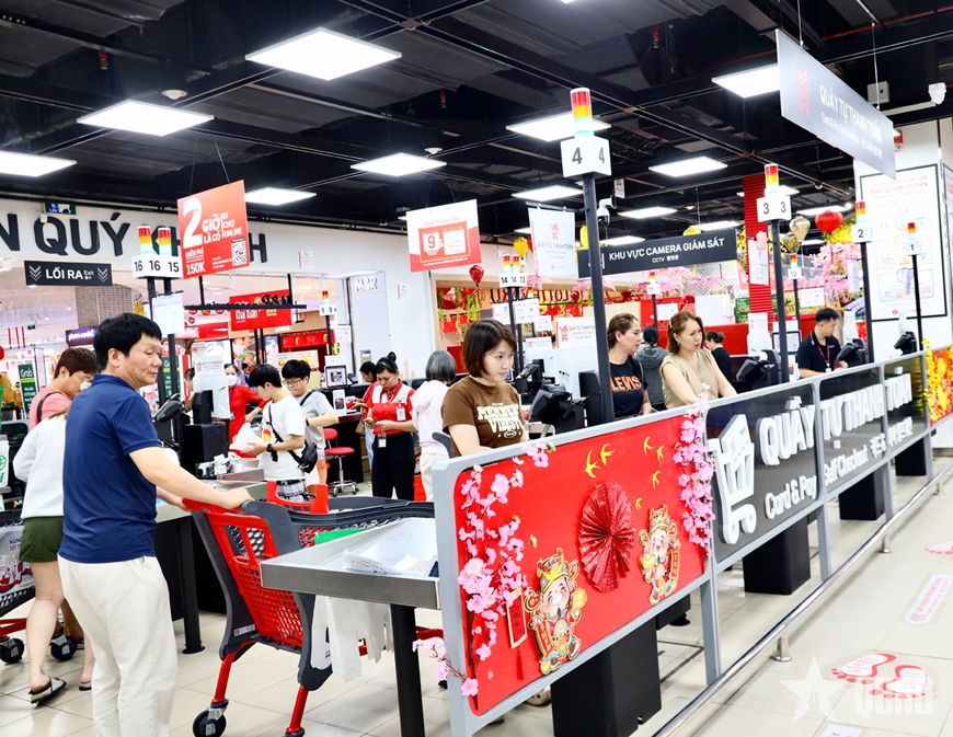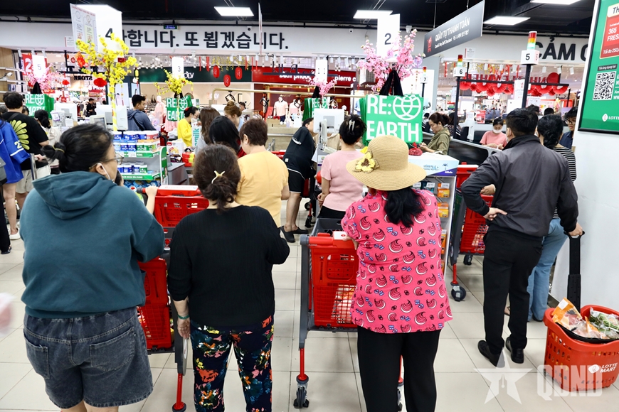 Tại các siêu thị lớn, lượng khách tăng đột biến so với ngày thường. Khu vực thực phẩm tươi sống, bánh kẹo, nước giải khát, giỏ quà Tết luôn trong tình trạng đông kín. Nhiều gia đình lựa chọn mua sắm trọn gói, đẩy xe hàng đầy ắp để tiết kiệm thời gian. Các quầy thu ngân hoạt động liên tục, dòng người xếp hàng trật tự, nhịp nhàng. Nhân viên siêu thị tất bật bổ sung hàng hóa, sắp xếp kệ trưng bày, bảo đảm nguồn cung phục vụ nhu cầu tăng cao.