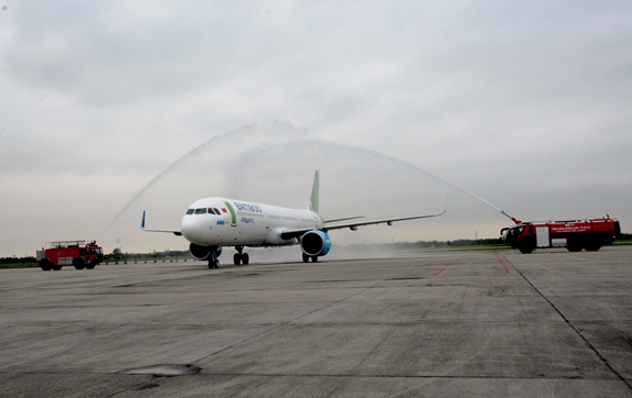 Chuyến bay đầu tiên trên đường bay mới kết nối TP Hải Phòng hạ cánh tại Cảng HKQT Cát Bi.