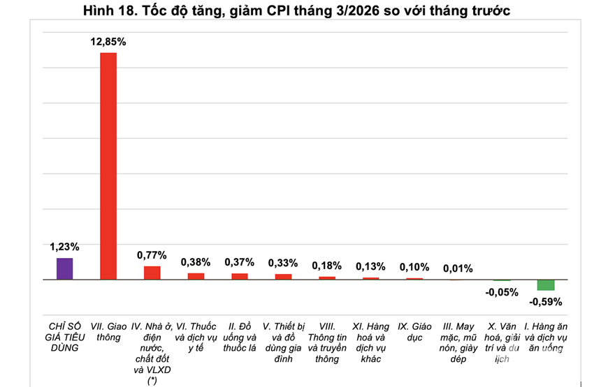 Chỉ số giá tiêu dùng (CPI) tháng 3-2026 tăng 1,23% so với tháng trước do giá xăng dầu trong nước tăng cao theo giá nhiên liệu thế giới, cùng với giá vật liệu xây dựng tăng do chi phí nguyên liệu đầu vào và vận chuyển gia tăng. So với tháng 12-2025, CPI tháng 3 tăng 2,44% và tăng 4,65% so với cùng kỳ năm trước. Đây là mức tăng CPI cao nhất của tháng 3 so với cùng kỳ năm trước trong 5 năm qua.