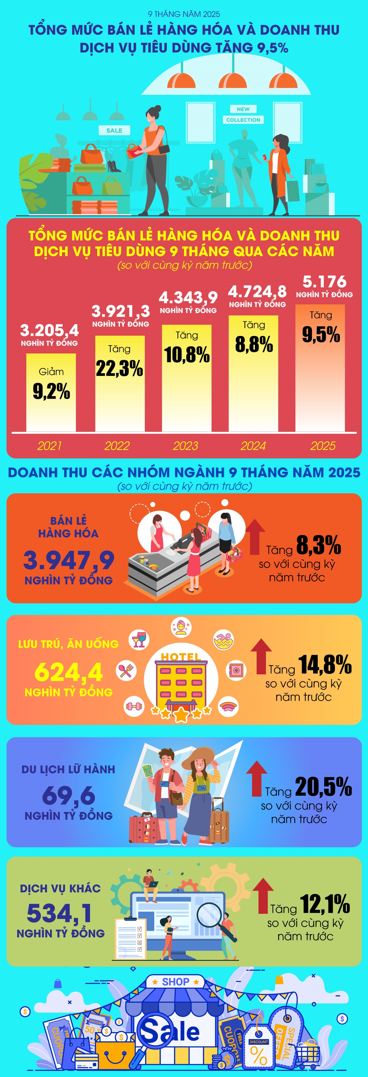 9 tháng năm 2025, tổng mức bán lẻ hàng hóa và doanh thu dịch vụ tiêu dùng theo giá hiện hành ước đạt 5.176,0 nghìn tỷ đồng, tăng 9,5% so với cùng kỳ năm trước. Trong đó: Doanh thu dịch vụ lưu trú, ăn uống tăng 14,8% và doanh thu du lịch lữ hành tăng 20,5%...