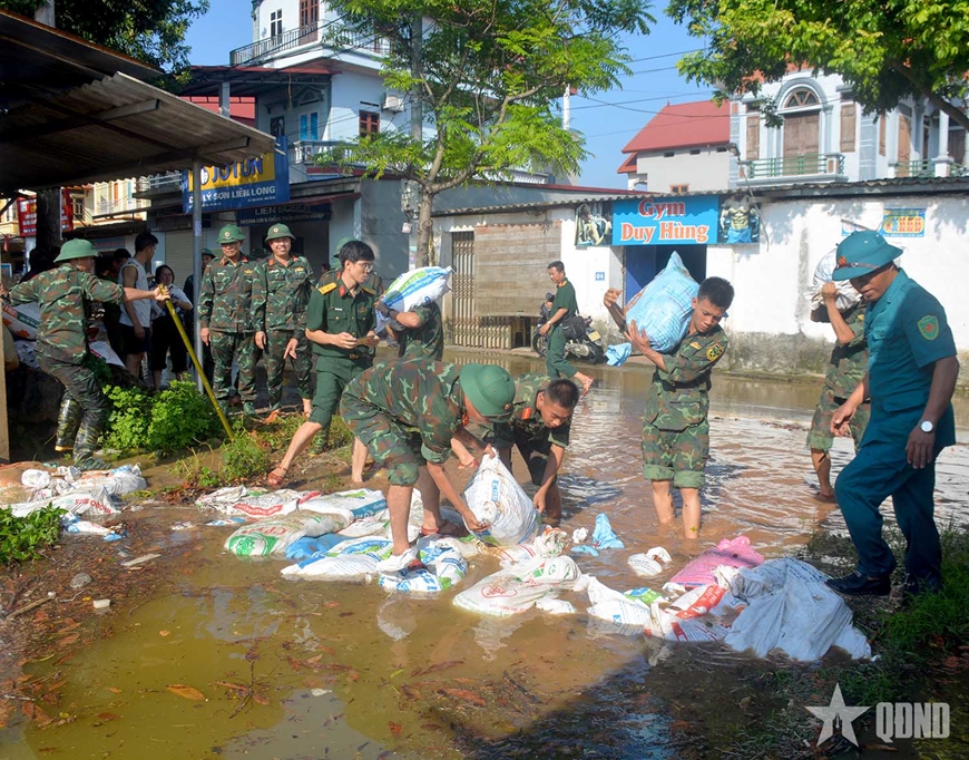 Cán bộ, chiến sĩ Trung đoàn 141 (Sư đoàn 312, Quân đoàn 12) đắp bờ bao chống ngập cho khu dân cư thôn Xuân Tàng (xã Đa Phúc, Hà Nội). |