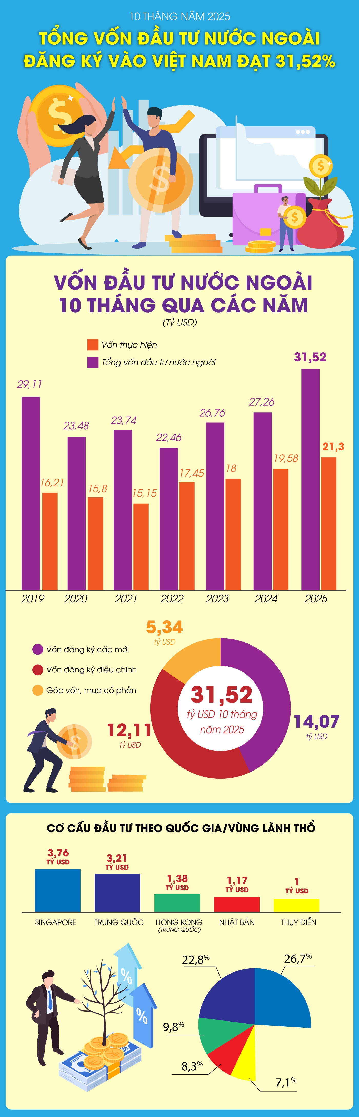10 tháng năm 2025, tổng vốn đầu tư nước ngoài đăng ký vào Việt Nam tính đến ngày 31-10-2025 bao gồm: Vốn đăng ký cấp mới, vốn đăng ký điều chỉnh và giá trị góp vốn, mua cổ phần của nhà đầu tư nước ngoài đạt 31,52 tỷ USD, tăng 15,6% so với cùng kỳ năm trước.