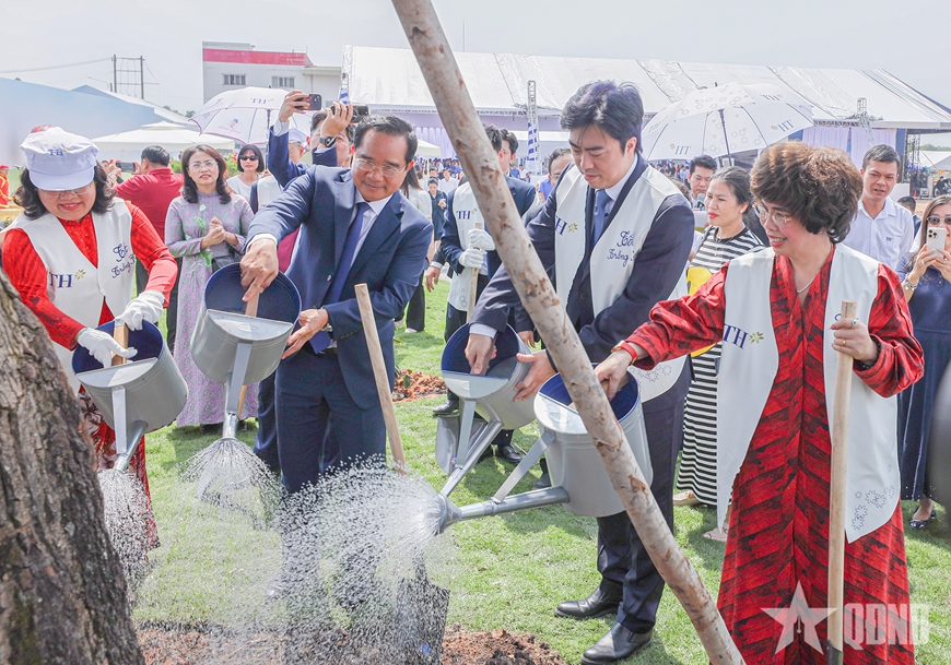 | Các đại biểu tham gia trồng cây xanh sau lễ khởi công. |