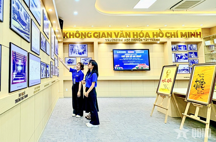 Sinh viên Đại học Nguyễn Tất Thành tham quan không gian văn hóa Hồ Chí Minh tại hội thảo. |