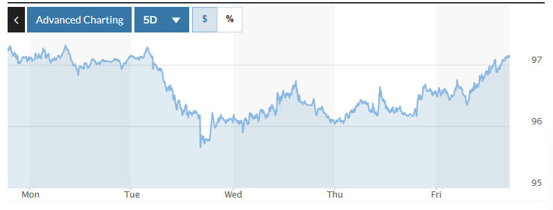 | Biểu đồ biến động Chỉ số DXY trong tuần qua. Ảnh: Marketwatch |