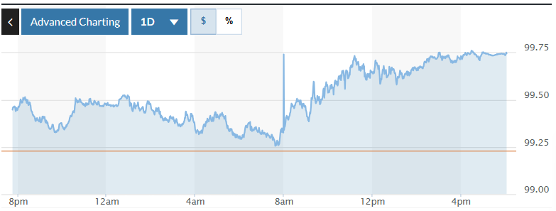 Biểu đồ biến động Chỉ số DXY trong 24 giờ qua. Ảnh: Market watch