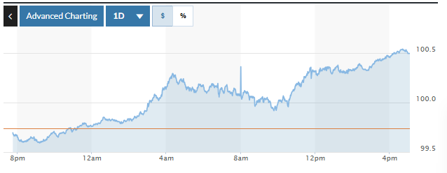 | Biểu đồ biến động Chỉ số DXY trong 24 giờ qua. Ảnh: Market watch |