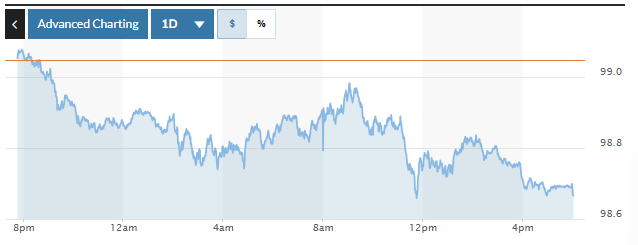 Trong khi đó, trên thị trường Mỹ, chỉ số US Dollar Index (DXY) đo lường biến động đồng bạc xanh với 6 đồng tiền chủ chốt (EUR, JPY, GBP, CAD, SEK, CHF) giảm 0,38%, hiện ở mức 98,67.