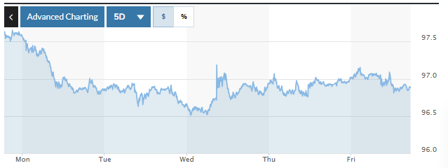 Chỉ số USD Index (DXY), đo lường biến động đồng bạc xanh với 6 đồng tiền chủ chốt giảm tuần 0,77%, xuống mức 96,88.