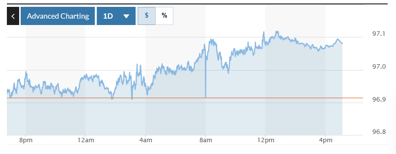 Biểu đồ biến động Chỉ số DXY trong 24 giờ qua. Ảnh: Market watch