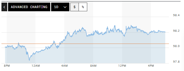 | Biểu đồ biến động Chỉ số DXY trong 24 giờ qua. Ảnh: Market watch |