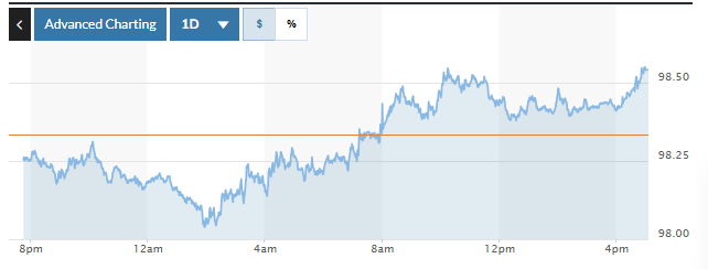 Biểu đồ biến động Chỉ số DXY trong 24 giờ qua. Ảnh: Marketwatch |