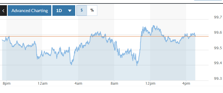 | Biểu đồ biến động Chỉ số DXY trong 24 giờ qua. Ảnh: Marketwatch