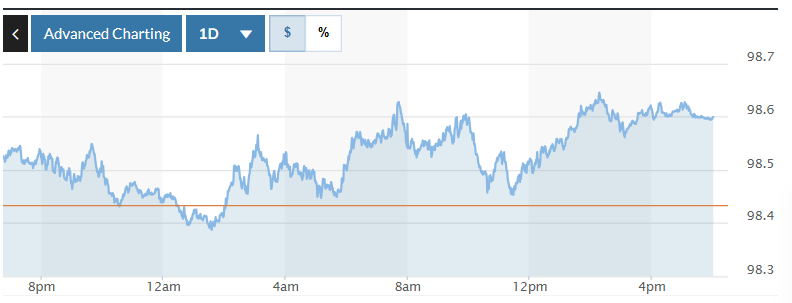 Trong khi đó, trên thị trường Mỹ, chỉ số US Dollar Index (DXY) đo lường biến động đồng bạc xanh với 6 đồng tiền chủ chốt (EUR, JPY, GBP, CAD, SEK, CHF) tăng 0,17%, hiện ở mức 98,60.