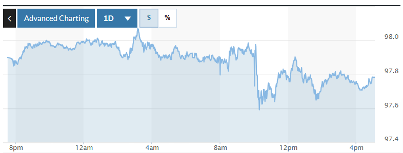 Biểu đồ biến động Chỉ số DXY trong 24 giờ qua. Ảnh: Market watch