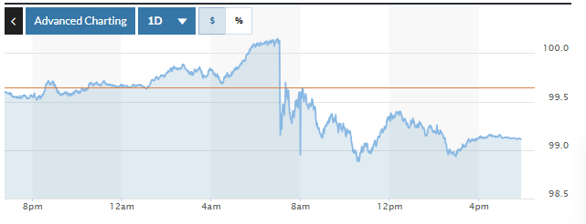 | Biểu đồ biến động Chỉ số DXY trong 24 giờ qua. Ảnh: Market watch |