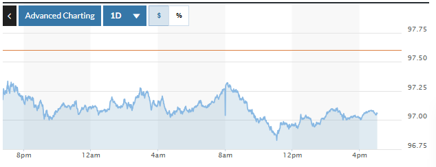 Trên thị trường Mỹ, chỉ số US Dollar Index (DXY) đo lường biến động đồng bạc xanh với 6 đồng tiền chủ chốt (EUR, JPY, GBP, CAD, SEK, CHF) giảm 0,55%, hiện ở mức 97,06.