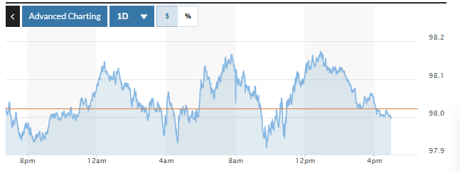 Trên thị trường Mỹ, chỉ số US Dollar Index (DXY) đo lường biến động đồng bạc xanh với 6 đồng tiền chủ chốt (EUR, JPY, GBP, CAD, SEK, CHF) giảm 0,03%, hiện ở mức 98,00.