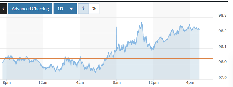 Biểu đồ biến động Chỉ số DXY trong 24 giờ qua. Ảnh: Marketwatch