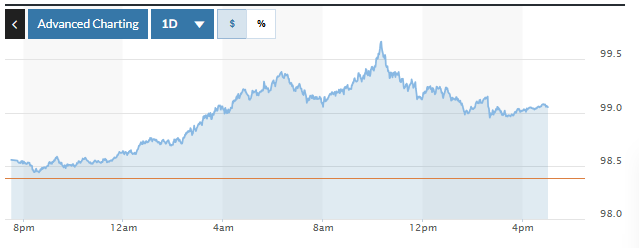 | Biểu đồ biến động Chỉ số DXY trong 24 giờ qua. Ảnh: Market watch |