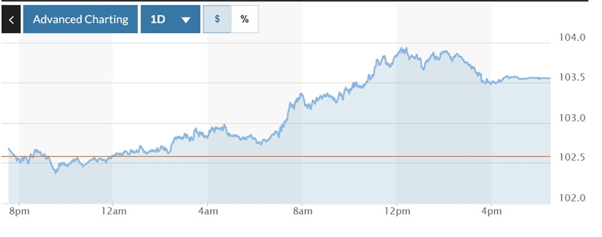 Chỉ số DXY đạt 103,94, cao nhất kể từ tháng 12 năm 2002, trước khi giảm trở lại mốc 103,55.
