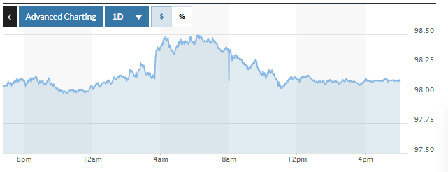 Biểu đồ biến động Chỉ số DXY trong 24 giờ qua. Ảnh: Marketwatch |